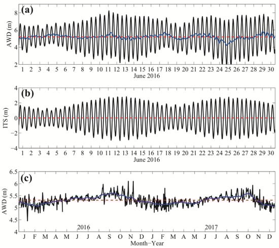 Figure 4b shows the integrated tidal signal (ITS) of the above six components in June. The neap tides for this regard occurred around 4 and 18 June, and the spring tides occurred around 12 and 25 June. The maximum ITS amplitude was 3 m during spring tide, indicating a maximum 6 m SSE difference over the whole day. Note that the maximum amplitude of the ITS was slightly smaller than that of the sum of amplitudes of six tidal components due to the interactions among different components. The minimum ITS amplitude was only 1 m, with a 2 m SSE difference. The residual signal of the difference between the SSE and ITS indicates the effect of other ocean dynamics beyond tidal processes, such as mesoscale eddies and coastal waves (blue in Figure 4a). However, the magnitude of the residual signal was no more than 0.2 m, which was much weaker than that of the ITS. In this paper, the original SSE observations were incorporated for calculating momentum fluxes. Figure 4c shows the daily mean AWD and the monthly mean results from 2016 to 2017. Significant seasonal variations can be found: a low AWD of 5 m was observed in February, and a high AWD of approximately 5.5 m was observed in September. However, there is no clear, dynamic explanation of these seasonal variations in terms of the coastal sea level in the ECS, and this is beyond the scope of this paper.