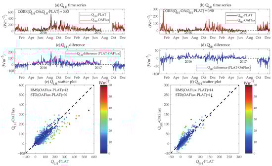 Estimated daily mean and ((a,b), unit: Wm−2) from 2016 to 2017 based on platform observations in ECS using COARE 3.0 bulk formulas (black) and OAFlux (red) data. (c,d): Estimated daily mean and differences between OAFlux and platform. (e,f): Scatter plots for the comparisons with the colours of the absolute difference between coastal platform observations and OAFlux.
