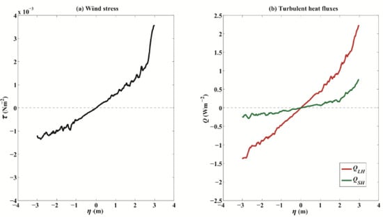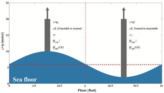 In Equation (7), 0.4 is the von Karman constant, g is the gravitational acceleration, is the mean temperature in the boundary layer, and . is the Reynolds stress term, where and represent the temperature and vertical motion, respectively, and the prime symbol denotes a fluctuation. The Monin–Obukhov length scale (L) represents the ratio of the work performed by the Reynolds stress to that performed by buoyancy forces. The unstable, near-neutral, and stable boundary conditions are determined by < −0.4, −0.4 < < 0.1 and > 0.1, respectively. The Monin–Obukhov length (L) and other scaling parameters have been reviewed by previous studies [32,33,38,39,40,41]. This paper focuses on the modification of the observational height z by SSE, , and thus, the boundary layer parameter (z/L) may vary as a result of changes in tidal elevation. An analysis of how the changes in SSE affect the BLS and air-sea momentum and turbulent heat fluxes is presented in Section 4.