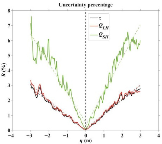 The uncertainty percentages (R) of wind stress (solid green), latent heat flux (solid red), and sensible heat flux (solid black) with variations in SSE () ranging from −3 to 3 m. The linear trends are incorporated with dashed lines.