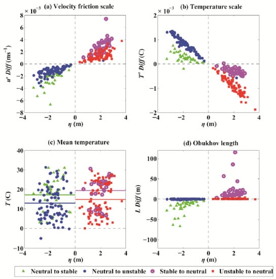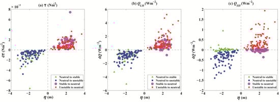 Figure 9 shows the hourly differences in wind stress, and between the estimates with and without SSE under different BLS changes. When the SSE drops, the observational height increases. The BLS can change from near-neutral to stable or unstable conditions. If the Monin–Obukhov length L (Equation (7)) decreases (positive ), thus dominating the increase in the Monin–Obukhov stability parameter , the BLS changes from near-neutral to stable conditions (green triangles) with a lower frictional velocity scale and a higher temperature T scale, resulting in relatively higher mean temperatures (Figure 10, Table 3). On average, the wind stress and flux decreased by 1.3 × 10−3 Nm−2 and 1 Wm−2, respectively. However, the had a weak mean increase, with a magnitude of 4 × 10−2 Wm−2, and increased approximately half the time. This result can explain the noise in the differences in between the estimates with and without SSE in Figure 6c. If the Monin–Obukhov length L is indeterminate (negative ), the reduced frictional velocity () and mean temperature () result in a smaller . The BLS then shifts from near-neutral to unstable conditions. In this situation, the wind stress and turbulent heat fluxes generally decrease (Table 3).