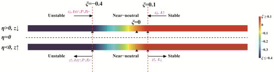 When the SSE increases, the observational height decreases. The BLS changes from stable or unstable conditions to a near-neutral state (Figure 10). In this situation, a smaller Monin–Obukhov stability parameter (positive ) causes the BLS to change from a stable to a near-neutral state (magenta circles in Figure 9 and Figure 10). The Monin–Obukhov length L significantly increases at a magnitude of 20 m, and a smaller Monin–Obukhov stability parameter is obtained with a reduced observational height. Otherwise, when is negative, the unstable state changes into near-neutral conditions. The wind stress and increased at magnitudes of 1 × 10−3 Nm−2 and 1 Wm−2, respectively, regardless of whether the conditions were stable or unstable. The increased by approximately 0.4 Wm−2 when the boundary condition shifted from an unstable to a near-neutral state but decreased slightly by approximately 2 × 10−2 Wm−2 (approximately half the time, Figure 9) when the BLS changed from stable to near-neutral conditions.
