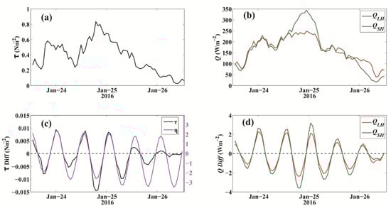 The wind stress (Nm−2, (a)) and turbulent heat fluxes (Wm−2, (b)) during the cold-air outbreak at the end of January 2016. (c): Wind stress differences (left y-axis) with variations in the magnitude of SSE (magenta, right y-axis) during cold-air outbreaks. (d) is the same as (c) but for (red, unit: Wm−2) and (green, unit: Wm−2).