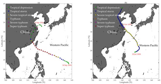 The trajectory of tropical cyclone (TC) Meranti (a) during 9~16 September 2016 and TC Ampil; (b) during 18~22 July 2018. The TC categories are labelled by circles in different colours. The Huo Xing Sha platform (magenta triangle) is near the trajectory of Meranti on 16 September 2016, when the TC category changed to a tropical depression and that of Ampil on 22 July 2018, when the TC category changed from severe tropical storm to tropical storm. The TC trajectory data were obtained from the China Meteorological Administration (CMA).