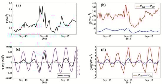 No TC directly passed the Huo Xing Sha platform during the two-year observation period in this study. However, TC Meranti, which originated in the western Pacific on 9 September 2016, transitioned from a super typhoon to a tropical depression quickly after making landfall in Fujian Province (Figure 13a). The tropical depression passed the platform as it travelled from land to sea on 16 September 2016. The maximum WS was approximately 16 ms−1, with a maximum RH of = 90% and a minimum SLP of 1005 hPa (Figure 3). On 16 September 2016, the maximum wind stress was approximately 0.4 Nm−2, which was smaller than that during the cold-air outbreak in winter (Figure 14). The was quite weak, with a mean magnitude of 10 Wm−2 from September 15 to 17, when the air-sea temperature difference was slight. However, the (evaporation) during the tropical depression was enhanced due to a high RH and high WS. The maximum was 326 Wm−2 on September 16 but decreased sharply to approximately 80 Wm−2 as a result of a sharp decrease in WS. The semidiurnal tidal SSE ranged from −2.5 to approximately 3.5 m, which caused maximum differences in wind stress, , and between the estimates with and without SSE of 0.01 Nm−2, 5 Wm−2, and 1 Wm−2, respectively.