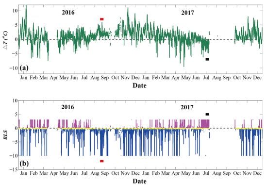 (a). The hourly air-sea temperature differences () from January 2016 to December 2017. (b). The hourly boundary layer stability (BLS) associated with the Monin–Obukhov stability parameter . Note that the stable boundary conditions ( > 0.1) are plotted in magenta, while the unstable ( < −0.4) and near-neutral (−0.4 < < 0.1) boundary conditions are plotted in blue and yellow, respectively. The smaller than −10 are set to −10 for visual examination. The hourly ten-day unstable BLSs (blue) and positive air-sea temperature differences are marked by red bars from September 2 to 11 September in 2016, while the stable BLCs (magenta) and negative air-sea temperature differences are marked by black bars from 16 July to 25 July in 2017.