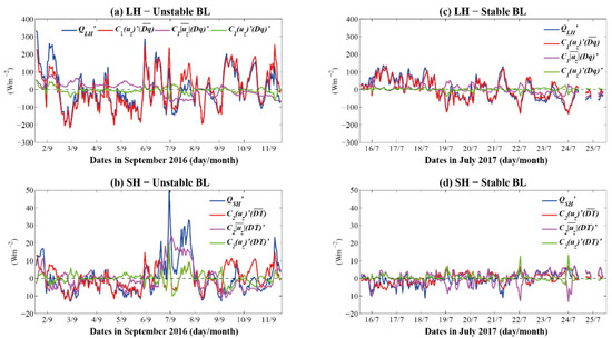 In Equations (14) and (15), terms A, B, C, and D represent the hourly anomalies of turbulent heat fluxes, the contributions of wind anomalies, the contributions of thermal difference anomalies, and the nonlinearity between B and C, respectively. The primes in the above two equations denote the hourly anomalies with respect to the ten-day mean values under unstable (2 to 11 September in 2016) or stable (16 to 25 July in 2017) BLSs. The ten-day period was chosen based on the continuous states of the BLS (Figure 16b) and the air-sea temperature difference (Figure 16a).