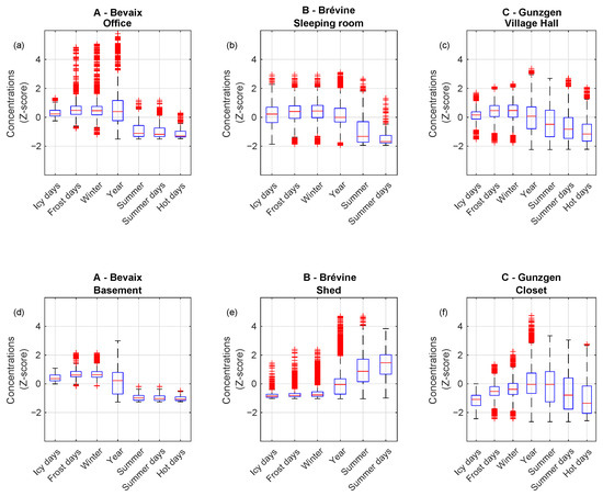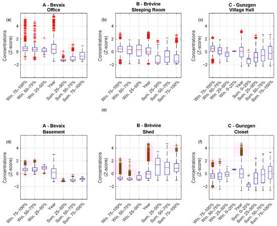Box-plots synthesizing the impacts of outdoor air temperature on a yearly basis, summer and winter seasons, as well as for temperature thresholds on IRC at Bevaix (a,d), La Brévine (b,e), and Gunzgen (c,f). Occupied spaces are shown in (a–c) and unoccupied spaces in (d–f).