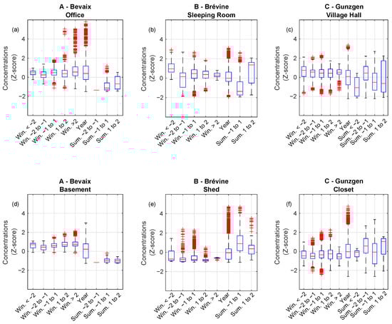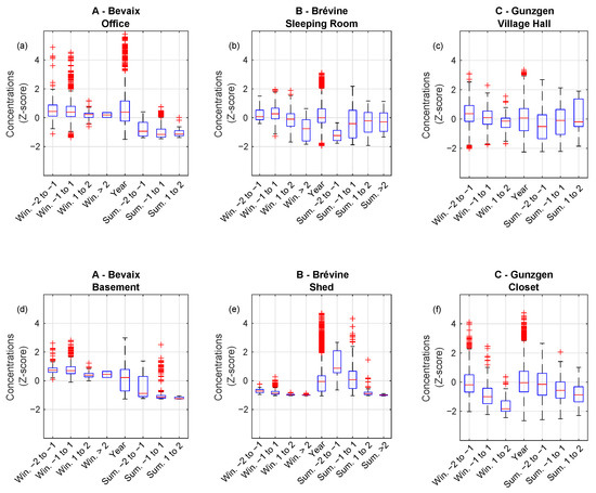 Box-plots synthesizing the impacts of easterly winds on IRC at Bevaix (a,d), La Brévine (b,e), and Gunzgen (c,f). Occupied spaces are shown in (a–c) and unoccupied spaces in (d–f). Annual standard deviation threshold results are given for both winter and summer. Some of them are missing because they did not occur.