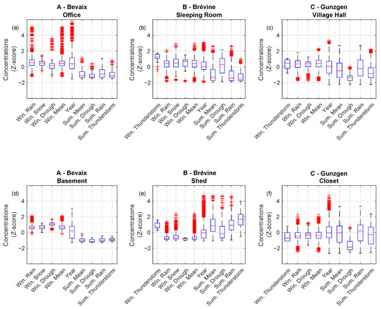 Box-plots synthesizing the impacts of atmospheric pressure on IRC at Bevaix (a,d), La Brévine (b,e), and Gunzgen (c,f). Occupied spaces are shown in (a–c) and unoccupied spaces in (d–f). Annual standard deviation threshold results are given for both winter and summer. Some of them are missing for summer because they did not occur.
