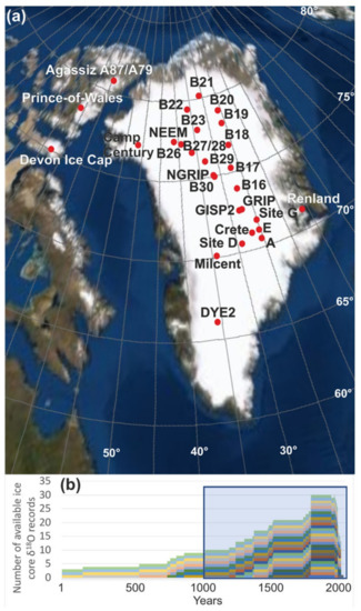 Ice core-derived δ18O records were obtained from the Iso2k database [23,24] utilizing all ice core-derived δ18O records with annual resolution poleward of 59° N from the GrIS and its vicinity (n = 30; Figure 1 and Figure S3). This improved spatial coverage compared with previous multi-ice core studies—e.g., Vinther et al. [11] and Ortega et al. [15]—helps to identify possible regional imprints inherent to the synoptic patterns influencing Greenland climate variability.