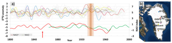 Time series of the studied ice core δ18O records and the instrumental NAO and NAO* reconstruction indices since 1800 CE with the most recent changepoint horizon centered at year 1933 (orange vertical rectangle) (a) and the location of the ice cores providing information from 1933 (b). The filled circles refer to the cores that indicated a changepoint in 1933, while the empty circles mark the ice cores not showing a changepoint. The codes next to the circles represent their “siteName” in the Iso2k database [23,24]. The colors of the markers in (b) match a corresponding time series in (a). The red arrow indicates a changepoint in the NAO* with a posterior probability above 99% that did not match any changepoint in the ice core δ18O records.