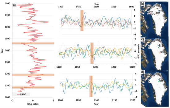 Pre-industrial changepoint horizons in the (a) reconstructed NAO (NAO*) time series and in the ice cores centering in years (b) 1460, (c) 1190, and (d) 1085 CE. The orange horizontal (a) and vertical (b) rectangles mark the CpHs. The maps next to the time series show the ice cores, which provided information at the time of the given CpH. The empty circles on the map mark the ice cores providing information from the time of the given CpH but not indicating a changepoint. The filled circles indicate a changepoint, and their colors match a corresponding time series (a). The code next to the circles represents their “siteName” in the Iso2k database [23,24].