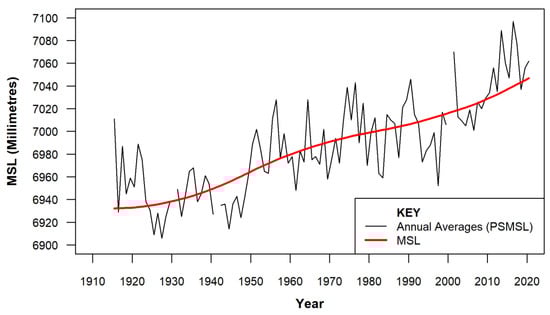 A range of data sources have been used to facilitate different parts of the analysis. Annual average time series data for Fort Denison from the public archives of the Permanent Service for Mean Sea Level (PSMSL) [33,34] (Station ID = 196) have been used in the MSL analysis spanning the period from 1915 to 2020 (inclusive).