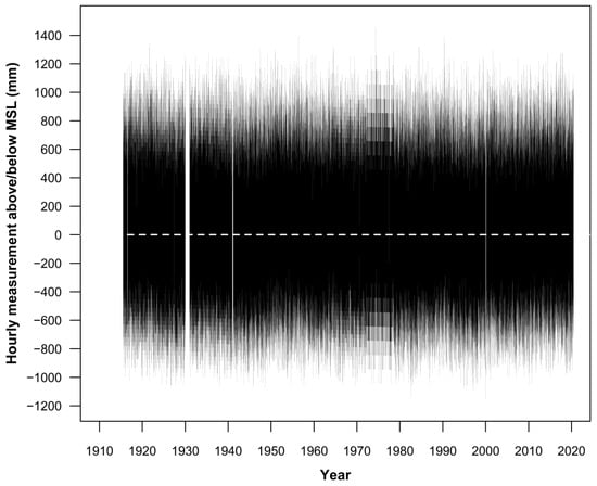 Figure 3 summarises the hourly water level heights both above and below MSL over the same time frame, noting these measurements are the key artefact of interest for EVA. Some 903,659 hourly measurements spanning 105 years are available for analysis. The largest hourly water level height above MSL of +1456 mm was recorded on 25 May 1974 (1300 h) whilst the largest measurement below MSL of −1150 mm was recorded on 24 December 1999 (0600 h).