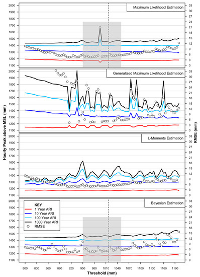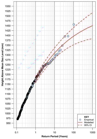 Based on sensitivity testing, Arns et al. (2013) [27] provided a range of recommendations for EVA using hourly tide gauge records, including setting the threshold for POT analysis at the 99.7th percentile of hourly measurements and optimizing the selection of parameters for GPD fitting using an MLE approach. The determination of the optimal threshold level to adopt when applying the POT approach dominates much of the contemporary literature around EVA. The testing and selection approach by Arns et al. (2013) [27] to recommend use of the 99.7th percentile of hourly measurements was based on a rational desire to seek a less subjective approach. However, the approach advocated in this paper to consider various key metrics, graphically represented across a range of thresholds and parameter optimisation approaches (Figure 4 and Figure 5), provides a more robust and objective methodology given any overly sensitive artefacts of parameter optimisation fitting are immediately apparent (and therefore avoided). This is enhanced by the ready availability of diagnostic tools available in modern EVA software. It is acknowledged in this case that the selection of the of 99.7th percentile of hourly measurements (1017.1 mm) would have resulted in a near identical outcome for the model fit and predicted extreme values (refer Table 6), only that the RMSE for the model fit improves slightly from 5.46 mm to 4.59 mm for the threshold of 970 mm adopted in this study.