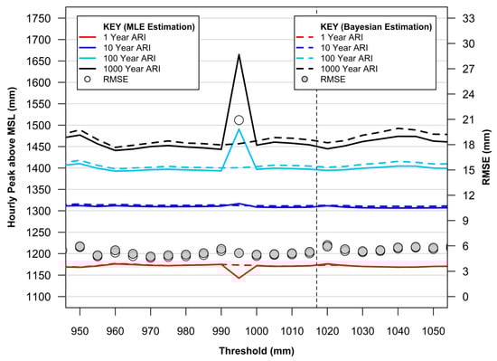 Firstly, from Figure 5, both the MLE and Bayesian approaches produce overwhelmingly consistent, robust predictive models for extreme value application, notably in the threshold range between 970 and 1015 mm as denoted by the lower RMSE’s.