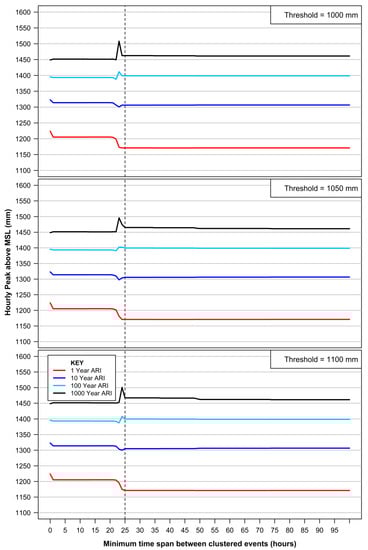 To satisfy statistical independence protocols between extreme events, the data must be carefully declustered. Following considerable sensitivity testing, Arns et al. (2013) [27] recommended that hourly tide gauge measurements used for EVA could satisfy independence requirements by setting a minimum of 25 h between separate extreme events. Figure 7 provides the results of sensitivity testing for extreme return periods, using three separate thresholds, by varying the delustering time between extreme events from 0 to 100 h. Similar to the results of Arns et al. (2013) [27], there is limited influence on the predicted extreme return periods once the time between successive extreme peaks increases to 25 h. This is to be expected with the lunar day being 24 h and 50 min; thus, by setting the declustering limit between peaks to at least 25 h, successive tidal peaks will be considered within the same extreme event, which is a key consideration when extreme events coincide with high spring tidal phenomena. When the declustering of events is set at a threshold less than 25 h, successive large tidal peaks which form a significant portion of the peak water level for the same extreme event will be considered separate extreme events, violating the independence assumptions underpinning GPD and POT theory.