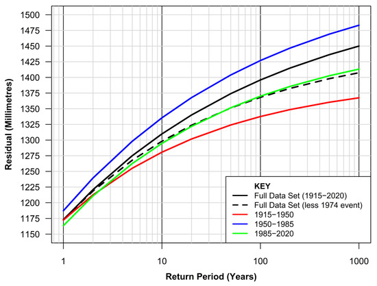 Figure 8 summarises outputs from one-third portions of the data set (1915–1950, 1950–1985, 1985–2020) compared to the full data set (1915–2020) and the full data set with the exclusion of the 1974 event which dominates the record. Using the full data set and excluding the 3 hourly water levels measured around the peak of the event on 25 May 1974 reduces the predicted hourly peak above MSL for 10, 100, and 1000-year return period events by some 12 mm (1%), 28 mm (2%), and 42 mm (3%), respectively. This analysis provides some guide to the sensitivity of the results to such a pivotal event on the record, noting it is not uncommon for measurement system malfunction during very extreme natural events.