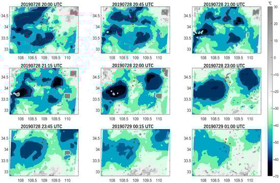 Satellite observations allowed for a general analysis of the cloud top data change process during this intense convective storm. Cloud top temperature (CTT) contour maps before and after the hailing process in the vicinity of the study area were plotted from FY-4A satellite remote sensing data. Figure 1 shows that the cumulus field in the air formed before hail was observed and covered the study area at 8:00 p.m. UTC on 28 July, after which the cumulus field shifted to the east. At 9:00 p.m. UTC, hail was recorded at the Lintong station, which was located at the center of the cumulus field, and the cumulus field started to show a tendency to gather. At 10:00 p.m. UTC, the cumulus field gathered into two cells located in the southwestern and northeastern parts of the study area. The northeastern unit was not discussed during the follow-up, whereas the southwestern unit continued to move eastward and moved over the observatory in the Chang’an district at 23:00 UTC. At this point, the cloud top temperatures in the vicinity of the three ground-based microwave radiometers showed a decrease from north to south, which also occurred at the end of the hailfall at the Lintong station. Thereafter, the two cumulus monoliths gradually weakened and disappeared, signifying the end of this strong convective process.