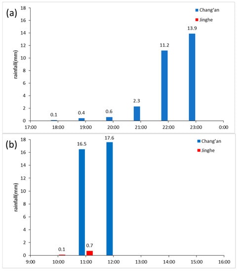 Hourly rainfall data of the Chang’an (blue) and Jinghe (red) meteorological stations during the hailfall process (a) and rainfall process (b).
