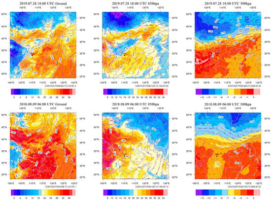 Weather map of the initial field of ground, 850 hPa, and 500 hPa isobaric pressure surfaces during the two precipitation events. The black line represents the horizontal wind field, the purple contour line represents the potential height (m), the ground plot is the sea level pressure field (hpa), and the color indicates the temperature (°C).