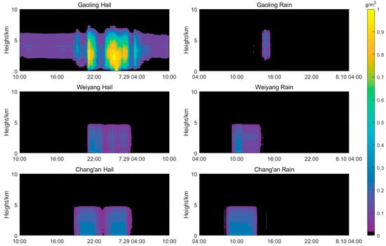 Changes in the liquid water profile during a hailstorm in the Gaoling, Weiyang, and Chang’an districts (left, starting at 4:00 p.m. UTC on 27 July 2019) and rainfall (right, rainfall process, starting at 4:00 p.m. UTC on 8 August 2018).