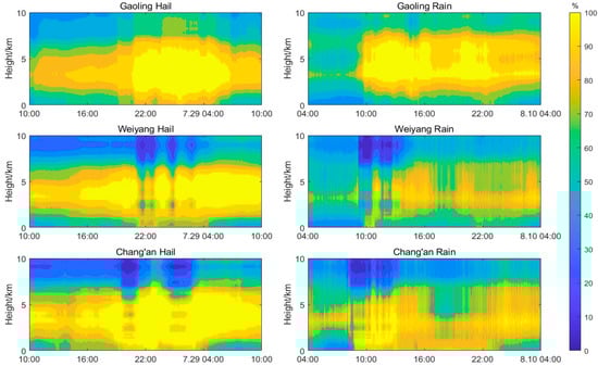 Further analysis of the water vapor relative humidity vertical profile shows that during the two precipitation events, the relative humidity profiles in both the Chang’an district and Weiyang district produced sudden “hole” changes during the precipitation period. Specifically, the hailstorm process from 8:00 p.m. to 9:00 p.m. in the Chang’an district mainly produced a “hole” at heights above 5 km, where the relative humidity dropped from 30% to near 0; from 9:00 p.m. to 11:00 p.m., a low-value zone was produced at 1 km–10 km in the Weiyang district, where the relative humidity dropped from near 100% to 60% at heights below 5 km and from 40% to near 0 at heights above 5 km (Figure 5). The rainfall process in the Chang’an district mainly produced a low-value zone at heights above 5 km from 8:00 a.m. to 10:00 a.m., with the relative humidity dropping from 40% to near 0. The Weiyang district produced a low-value zone at 1 km–10 km from 9:30 a.m. to 10:30 a.m., with the relative humidity dropping from near 100% to 60% at heights below 5 km and from 40% to near 0 at heights above 5 km. The relative humidity dropped from nearly 80% to 60% at altitudes below 5 km and from 40% to nearly 0 at altitudes above 5 km. The relative humidity dropped from nearly 80% to 60% at altitudes below 5 km and from 40% to nearly 0 at altitudes above 5 km. These “hole” changes at altitudes below 5 km indicated a rapid change from gas to liquid within the cloud, and it can be inferred that the condensation and growth of cloud droplets rapidly occurred, further accelerating the spread and growth of cloud droplets and the formation of raindrops, which simultaneously corresponded to the increase in the concentration of the liquid water profile. This change in the relative humidity of the water vapor above a 5 km altitude may have included not only the transformation of the gaseous state to the liquid state but also the transformation of the gaseous state to the solid-state and the generation of ice-phase particles. It is difficult to further separate the processes of cold clouds using only the relative humidity changes. Regardless of the precipitation process, the relative humidity characteristics over Gaoling did not show obvious “hole” changes, which means that there was no rapid transformation of precipitable water particles over Gaoling, which is consistent with the results of the previous analyses of liquid water and ground precipitation.