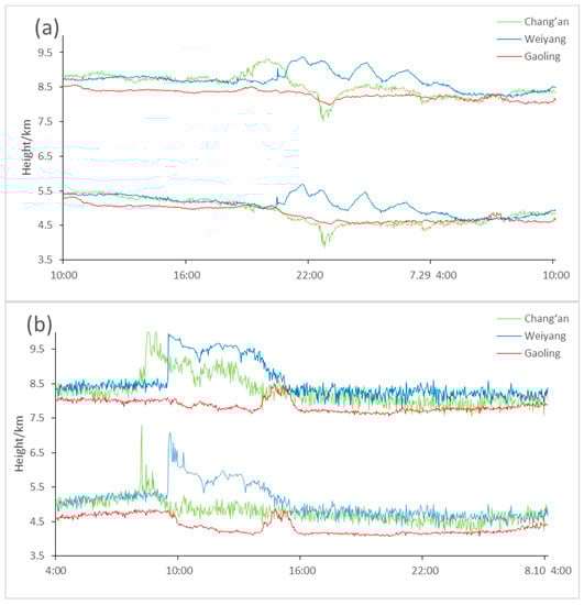 To further distinguish the differences in intracloud features between the two precipitation processes and among the three sites, we further compared the height changes at the 0 °C and −20 °C layers. The height layer between the 0 °C layer and the −20 °C layer represents the key height range of both warm hydrometers and ice-phased hydrometers, which can well reflect the characteristics within strong convective clouds. Comparatively large fluctuations in the heights of the 0 °C layer and −20 °C layer occurred in both the Chang’an district and Weiyang district during the two precipitation processes (Figure 6). In the individual cases of hailfall, the −20 °C layer in the Chang’an district began to rise at 6:00 p.m., which was earlier than the rise of the −20 °C layer in the Weiyang district. This finding is verified with the results of the previous analysis that indicate that the moment the liquid water rises, the relative humidity begins to suddenly drop, and precipitation occurs on the ground. At the moment when the hail was collected on the ground at the Lintong station, the 0 °C height at the Weiyang district exhibited a similarly rising and falling fluctuation at −20 °C beginning at 9:00 p.m., which indicated that a very strong latent heat release occurred over the Chang’an district, especially at the −20 °C height at 18:00. In addition, this result indicated that the latent heat release process was so strongly dominated by ice-phased hydrometers that large, relatively fast-falling ice particles such as shrapnel or hail were produced, and their fall caused a rapid decrease at −20 °C after 10:00 p.m. However, during the fall, there was a possibility that these particles completely melted and that no hail or shrapnel was observed on the ground (Figure 6a). The altitude changes at the 0 °C layer were dominated by the latent heat release from the warm cloud process, whereas the altitude changes at the −20 °C layer were dominated by the latent heat release from the ice-phased hydrometers. The alternating changes in their ascent or descent were also caused by the reciprocal cycle of water condensation particles; however, no large hail or shrapnel particles were produced to cause the steep drops at these two altitudes. In contrast, the heights of both the 0 °C layer and −20 °C layer in the Gaoling area remained fairly stable, indicating that neither significantly warm nor cold cloud precipitation processes occurred over Gaoling (Figure 6a). In the rainfall-only cases, the 0 °C and −20 °C layer heights in the Chang’an district and Weiyang district started to rapidly rise at 9:00 a.m. and 10:00 a.m., respectively, and then slowly decreased to a stable state, indicating that strong warm and cold cloud formation processes occurred in the clouds over both locations in this precipitation case, although no large, fast-falling ice particle hail or graupel was produced. Thus, there was no steep drop in the height of the 0 °C and −20 °C layers (Figure 6b).