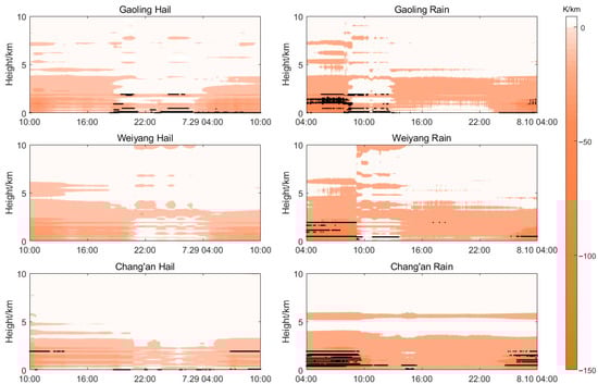 Hailstorms (left, starting at 4:00 p.m. UTC on 27 July 2019, as shown in Figure 4) and rainfall (right, rainfall process, starting at 4:00 p.m. UTC on 8 August 2018, as shown in Figure 4) potential temperature (when <0, represented by black dots) gradient and pseudoequivalent potential temperature gradient (filled color) in the Gaoling, Weiyang, and Chang’an districts.