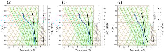 Skew−T diagrams of the initial temperature (black line), dew point temperature (blue line), and wind field (right-hand line) profiles used in this study: (a) Chang’an district, (b) Weiyang district, and (c) Gaoling district.