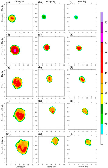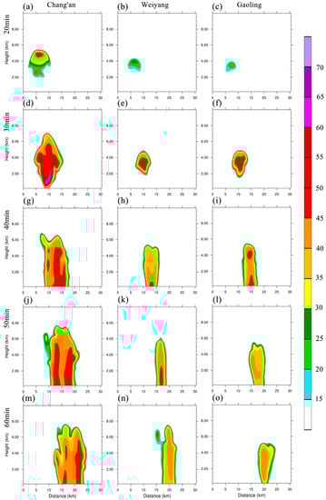 Radar reflectance (dBZ) over the model at 10-min intervals (where (a–c) are 20 min, (d–f) are 30 min, (g–i) are 40 min, (j–l) are 50 min, (m–o) are 60 min. (a,d,g,j,m) are Chang’an District; (b,e,h,k,n) are Weiyang District; (c,f,i,l,o) are Gaoling District).