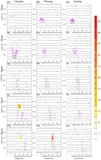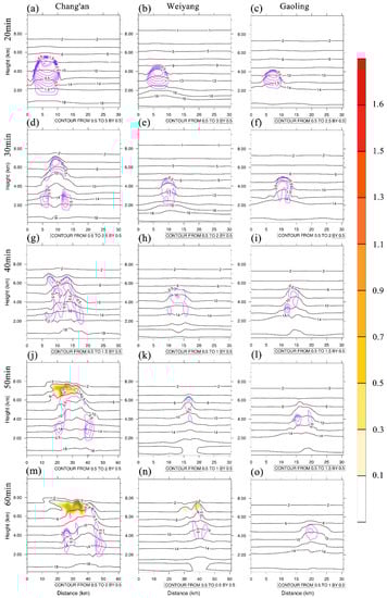 As shown in Figure 9, but for the horizontal profile, which is plotted at the location of the strongest combined radar reflectivity. (where (a–c) are 20 min, (d–f) are 30 min, (g–i) are 40 min, (j–l) are 50 min, (m–o) are 60 min. (a,d,g,j,m) are Chang’an District; (b,e,h,k,n) are Weiyang District; (c,f,i,l,o) are Gaoling District).