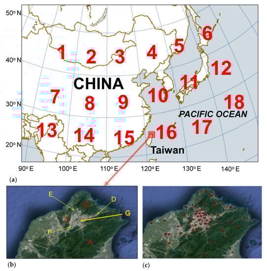 Geographical information of Taiwan. (a) Location of the Taiwan island and Taipei metropolis. (b) Topographical features of the Taipei metropolis. A: Snowy Mountains; B: Tatun volcano group; C: Linkou tableland; D: Xindian River Basin; E: Tamsui River Basin; F: Tahan River Basin; G: Taipei Basin. (c) Locations of the monitoring sites of the Environmental Protection Administration and Central Weather Bureau. Numbers correspond to number signs (No.) of sites in Table 1. Satellite figures were retrieved from Google Earth, available at: https://earth.google.com/web/@25.07001375,121.56191713,4.3012896a,106580.52557716d,35y,0.294h,0t,0r?utm_source=earth7&utm_campaign=vine&hl=zh-TW (accessed on 4 June 2022).