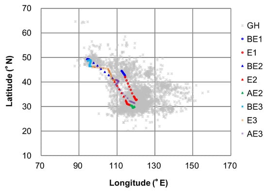 Distribution of the centres of continental high-pressure systems during general and event hours. GH: general hours; BE1: before event one stage; E1: during event one stage; BE2: before event two stage; E2: during event two stage; AE2: after event two stage; BE3: before event three stage; E3: during event three stage; AE3: after event three stage.