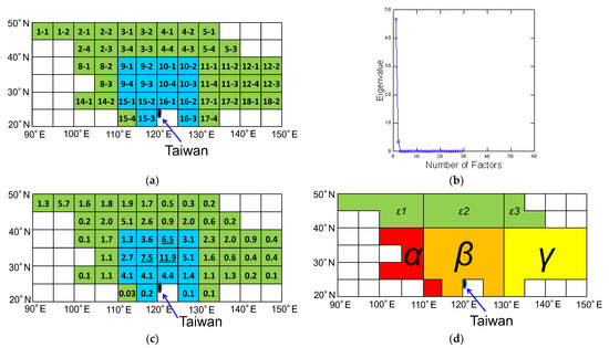 Association between the atmospheric environment in the Taipei metropolis and location of the continental high-pressure system (CHPS) as calculated using principal component analysis (PCA). (a) Assigned number of the location of CHPS centre. (b) Number of major factors and their eigenvalues. (c) Frequency (%) of the location of CHPS centres. Green regions indicate the first component of PCA, and blue regions indicate the second component of PCA on nine parameters. The Taiwan island is indicated as the dark region. (d) Four sub-groups (α, β, ɣ, ε). R-ε included sub-regions ε1, ε2, and ε3.