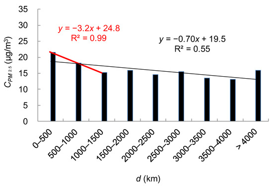 Relationship between mean PM2.5 concentration (, μg·m−3) in the Taipei metropolis and distance between the Taipei station and centre of the continental high-pressure system (d, km).
