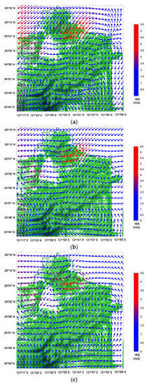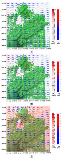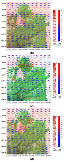 Compared with those in R-α and R-β, the easterly winds were more obvious than the northeasterly winds and the mean wind speeds were less in R-γ (Figure 5). The double GCEs in the Xindian and Tahan River Basins were less obvious in R-γ than in R-α and R-β. The mean wind speed may have been low to generate an obvious GCE. Overall, the following major feature was noted when double GCEs occurred in the Taipei Basin: most mean resultant vectors were <90° in areas between 25°07′ N–25°18′ N and 121°15′ E–121°47′ E. In the present study, this region was considered the upwind area of the Taisumi and Xindian River Basins (UARB). Compared with that in R-α, air dispersion was greater in R-β. However, PI was significantly greater in R-β, although the double GCEs occurred in both R-α and R-β. Therefore, other factors likely influenced PI. The following three case studies may help clarify reasons underlying the occurrence of PM2.5 events.