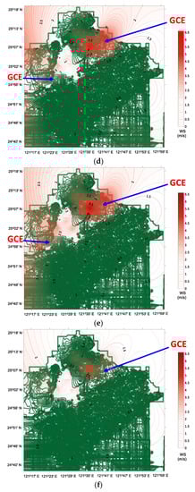 Mean wind speed (m·s−1) and resultant vectors (degree) in the Taipei metropolis when the centres of the continental high-pressure system (CHPS) were in different regions: (a) region-α; (b) region-β; (c) region-γ. Mean wind speed (m·s−1) and geographical channel effect (GCE) in the Taipei metropolis when the centres of CHPS were in different regions: (d) region-α; (e) region-β; (f) region-γ.
