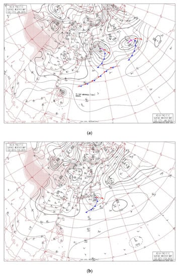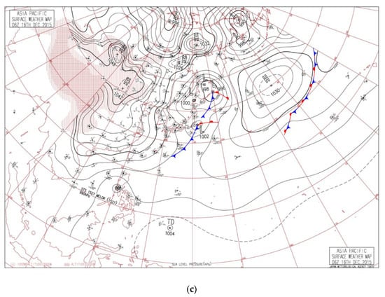 Surface weather map of East Asia: (a) at 20:00 LST on 17 January 2015; (b) at 20:00 LST on 5 February 2015; (c) at 14:00 LST on 16 December 2015.