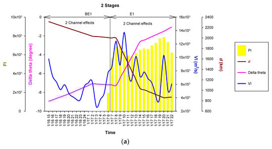 Time series of PM2.5 concentration (μg·m−3), pollution index (PI), ventilation index (VI, m2·s−1), distance between the centre of the continental high-pressure system (CHPS) and Taipei (d, km), and difference in longitude (∆θ) between the CHPS centre and Taipei during the three periods: (a) period 1; (b) period 2; (c) period 3. BE1: before event one stage; E1: during event one stage; BE2: before event two stage; E2: during event two stage; AE2: after event two stage; BE3: before event three stage; E3: during event three stage; AE3: after event three stage.
