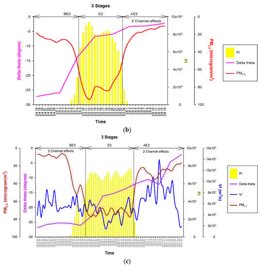 Periods one, two, and three, which represented three distinct CHPSs (Figure 2, Table 4), were used to assess the three PM2.5 events (event one between 7:00 and 22:00 LST on 17 January (16 h); event two between 9:00 and 23:00 LST on 5 February (15 h); event three between 17:00 LST on 15 December and 18:00 LST on 16 December (26 h)). According to the characteristics of CHPS, each period was divided into two or three stages to realize variations in events: before event one stage (BE1), during event one stage (E1), before event two stage (BE2), during event two stage (E2), after event two stage (AE2), before event three stage (BE3), during event three stage (E3), and after event three stage (AE3). Within the same period, the time length of a stage was the same. In comparison to periods two and three, the number of stages was less in period one because the CHPS centre dispersed after 22:00 LST on 17 January. Therefore, there was no after event one stage in period one.