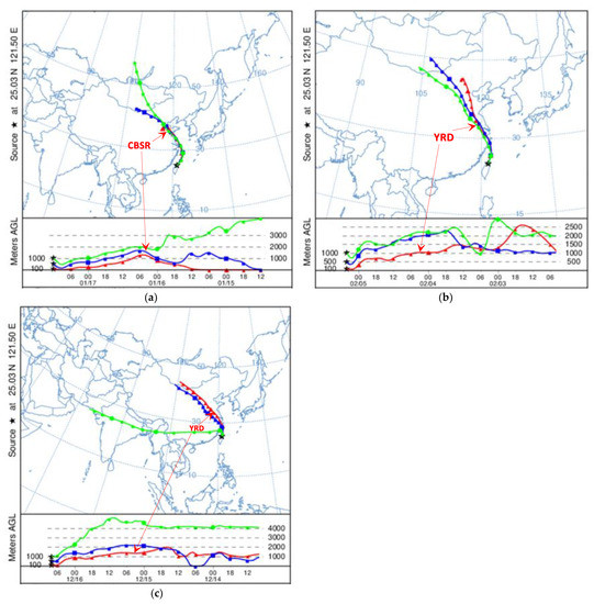 Back trajectory tracks run using NOAA HYSPLIT model, NASA/AERONET based on GDAS meteorological data of three PM2.5 events at the Taipei station ending (maximum in Taipei) at (a) 20:00 LST on 17 January 2015; (b) 12:00 LST on 5 February 2015; (c) 16:00 LST on 16 December 2015. Red line: 100 m-AGL; blue line: 500 m-AGL; green line: 1000 m-AGL.