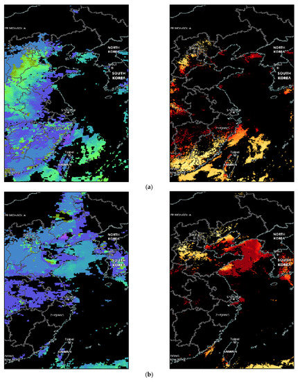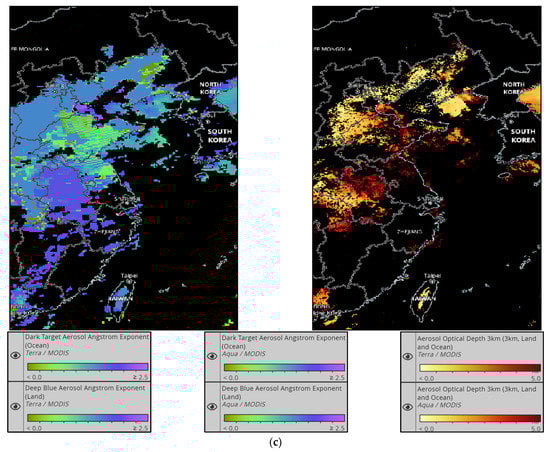 Satellite retrievals of Terra/MODIS and Aqua/MODIS from NASA Worldview merged Deep Blue Aerosol Angstrom Exponent (Land) and Dark Target Aerosol Angstrom Exponent (Ocean) are shown on the left; Aerosol Optical Depth 3km (3km, Land and Ocean) is shown on the right. (a) The Terra satellite passed over the Circum-Bohai-Sea region (CBSR) at 11:24–11:25 LST, and the Aqua satellite passed over CBSR at 13:02–13:03 LST, 16 January 2015; (b) the Terra satellite passed over Yangtze River Delta (YRD) at 10:16–10:17 LST, and the Aqua satellite passed over YRD at 13:33–13:34 LST, 4 February 2015; (c) the Terra satellite passed over YRD at 10:54–10:55 LST, and the Aqua satellite passed over YRD at 12:30–12:31 LST, 15 December 2015. Satellite figures were provided by Global Imagery Browse Services, NASA. The interactive interface for browsing global, full-resolution satellite imagery is available at https://earthdata.nasa.gov/gibs (accessed on 28 June 2022).