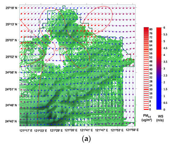 In the Taipei metropolis of Taiwan, pollution caused by fine PM with a diameter smaller than or equal to 2.5 μm (PM2.5) is prevalent during winters [1]. These air pollution events are attributed to two major causes: (1) emissions and (2) weather conditions, such as transport, downdraft, and air dispersion, amongst others. The link between transport and air pollution is evident [2,3]. Downdraft affects the conditions of air dispersion [4,5], and poor air dispersion worsens air quality, as stagnant atmospheric conditions aid the accumulation of air pollutants [6,7].