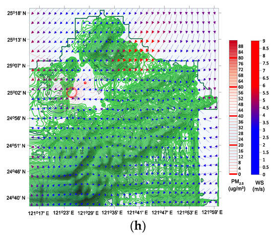 Distribution of mean PM2.5 (μg·m−3), mean wind speed (m·s−1), and the resultant vectors (degree) in the Taipei metropolis: (a) BE1; (b) E1; (c) BE2; (d) E2; (e) AE2; (f) BE3; (g) E3; (h) AE3. BE1: before event one stage; E1: during event one stage; BE2: before event two stage; E2: during event two stage; AE2: after event two stage; BE3: before event three stage; E3: during event three stage; AE3: after event three stage.