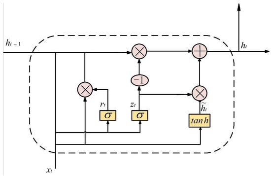 where is Hadmard product operation, is the time t state input, is the state function of the last hidden layer, is the reset gate function, is the update gate function, is the state of the hidden layer of time t, is the activation state of time t hidden layer, W and b represent the weight matrix and bias vector in the neuron, respectively, and their subscripts represent the position of the weight in the network; for example, is the weight matrix between the input and reset gate, is the offset vector of the reset door, represents the sigmoid function, and tanh function are commonly used activation functions. They can filter unimportant information, so that the output values of the two gate structures are compressed to the range of [0,1], and the expressions are shown in Equations (7) and (8), respectively.