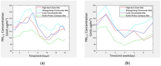 The Pearson correlation coefficient between any two different monitoring sites in is between 0.737 and 0.909. In Figure 5, the Pearson correlation coefficient is between 0.733 and 0.976. All of them showed a strong correlation, and it can be seen that the changing trend of PM2.5 concentration at the four monitoring sites are basically the same. In terms of temporal characteristics, PM2.5 concentration is the lowest at around 3–4 o’clock in the afternoon, and the highest concentration is around 7–8 o’clock in the morning during a day. Within a week, the PM2.5 concentration changed significantly, with a maximum difference of 47.18 ug/m3, which showed the highest on Tuesday. Except for High-tech Zone Site, which fell to the lowest on Saturday, the other three monitoring sites were the lowest on Thursday. Due to human activities, the value of PM2.5 will generally increase on Saturdays, Sundays, and Mondays. After life and work are stable, the value of PM2.5 will decrease. In terms of spatial characteristics, it can be seen from Table 2 that Shangcheng Community Site has the highest PM2.5 concentration and the largest fluctuation, NJAU-Pukou Campus Site is the lowest, and the change is the most stable, High-tech Zone Site and Luhe Countryside Site are at the same level. This is mainly due to Jiangbei New District focusing on the development of heavy and high-tech industry in recent years, resulting in increasingly serious air pollution. Compared with the other three monitoring sites, Shangcheng Community Site has more frequent staff movement, commercial activities, and more motor vehicle exhaust, which also lead to the increase of PM2.5 concentration. It shows that the air quality in Jiangbei New District has a strong correlation with the regional distribution.