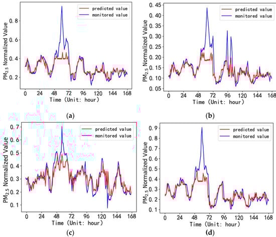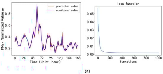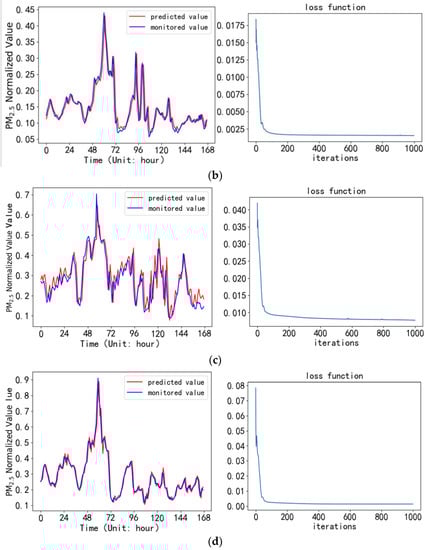 A PM2.5 concentration prediction model was established in the PyCharm compilation environment based on the above experimental environment configuration. The model used a test set to predict the PM2.5 hour average mass concentration in the next week for the four monitoring sites. The predicted values of the PM2.5 concentration are compared with the monitored value, and the loss functions during the iteration process were shown in Figure 5a–d.