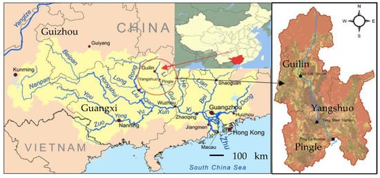 From the hilly and steep areas of north Guilin, which is part of the Maoershan Mountains, towards the flatter karstic landscapes of Yangshuo and Pingle counties (Figure 1) in the center and south, respectively, lies the famous Lijiang River with a total length of 214 km. As one of the eight tributaries of the well-known Pearl River in south China (Zhujiang in Chinese, the third largest river in the country), the Lijiang River plays a vital role in the watershed economy, transport, and drinking water supply. Lijiang has 13 tributaries and a total of 11,300 km2 catchment.